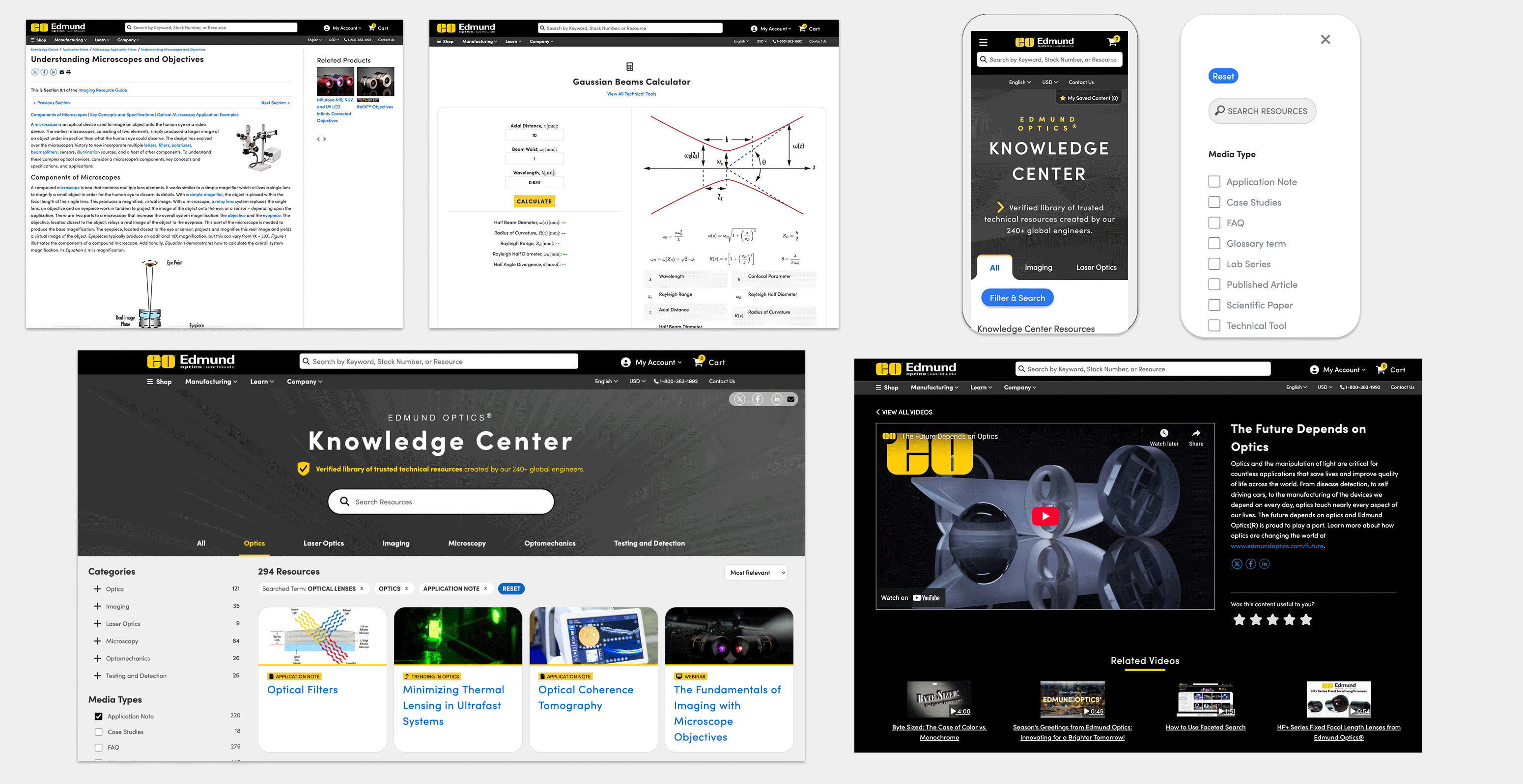Emdund Optics' Knowledge Center houses over 1,500 resources, including videos, application notes, technical tools, webinars, and more. The previous design consisted of disconnected lists, lacking organization. The goal was to create a filterable, user-friendly experience.